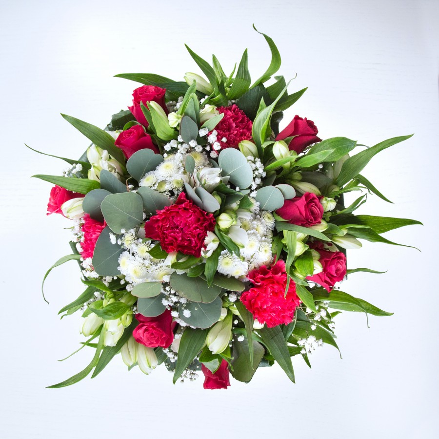 The red roses are stunning and the white blooms add a lovely contrast. Perfect for anniversaries.