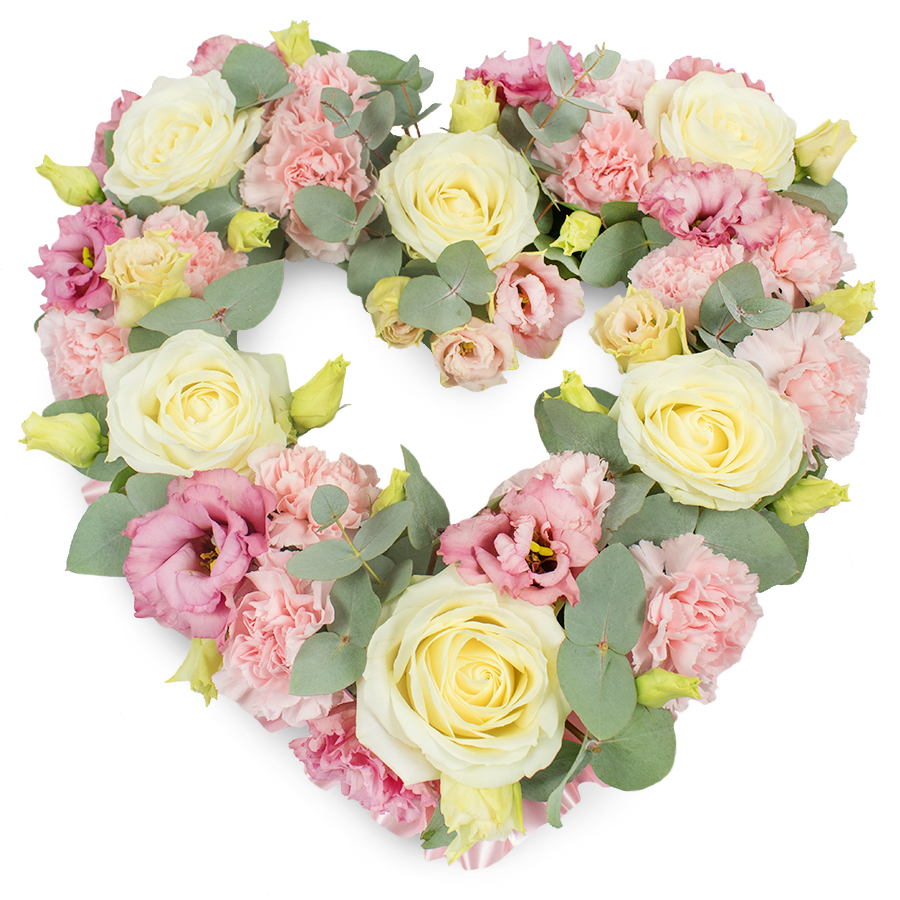Our Graceful Pink & White Floral Heart is a perfect symbol of love and remembrance. Featuring stunning white roses, vibrant pink carnations, delicate pink lisianthus, and soothing eucalyptus, this bouquet stands out for its beauty and elegance.